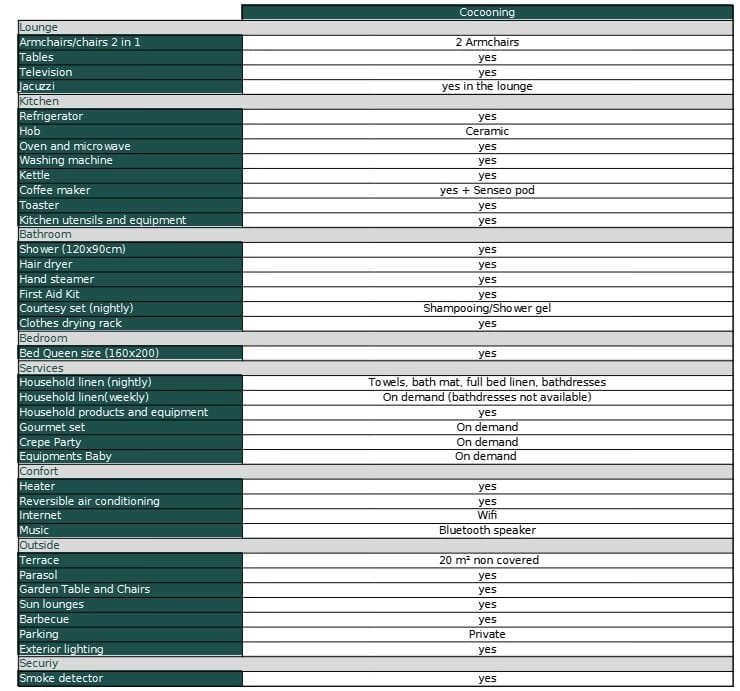 Layout: Total of 42m² including a living room/kitchen of 26m² with jacuzzi, a master bedroom of 16m² with bathroom of 4m² and a toilet. Identical to the Romantic cottage apart from the decoration, specific to the Cocooning style