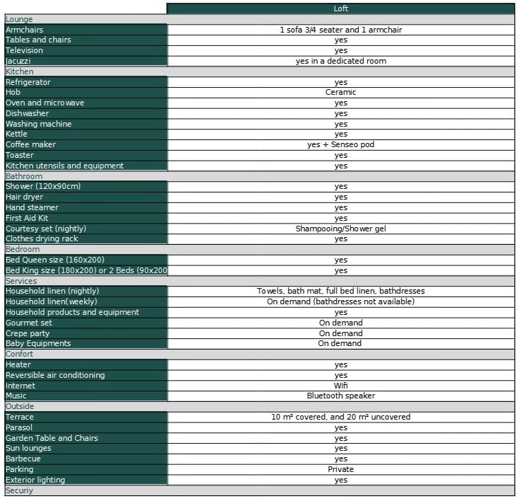 Layout: Total of 70m² including a living room/kitchen of 31m², a room of 13m² with glass partition overlooking the jacuzzi, two bedrooms of 10.50m² each, a bathroom with toilet 5m2 and an outdoor terrace of 30m². Identical to the Nature cottage apart from the decoration, specific to the Loft style