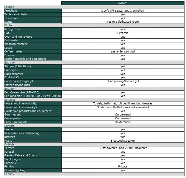 Layout: Total of 70m² including a living room/kitchen of 31m², a room of 13m² with glass partition overlooking the jacuzzi, two bedrooms of 10.50m² each, a bathroom with toilet 5m2 and an outdoor terrace of 30m². Identical to the Loft cottage apart from the decoration, specific to the Nature style