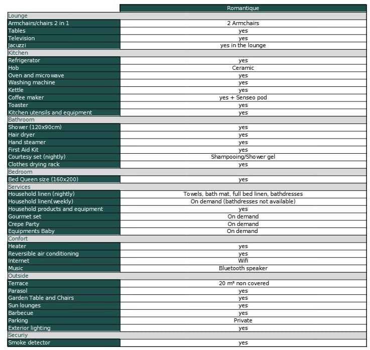 Layout : Total of 42m² including a living room/kitchen of 26m² with jacuzzi, a master bedroom of 16m² with bathroom of 4m² and a toilet. Identical to the Cocooning cottage apart from the decoration, specific to the Romantic style