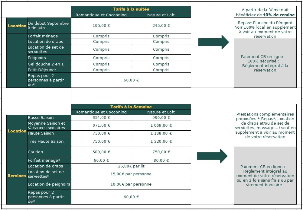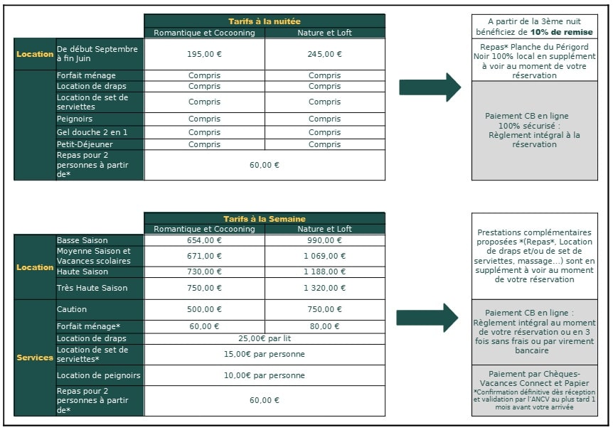 Pour la location à la nuit, le tarif est de 195€ à 245€ selon le gîte ; inclus le forfait ménage, la location de draps, set de serviettes, gel douche 2 en 1 et peignoirs ainsi que le petit déjeuner personnalisé et de qualité ; un formulaire est à remplir pour le choix de celui-ci, et vous sera transmis une fois la réservation effectuée. Ce service petit déjeuner est disponible uniquement au tarif de la nuitée. Une remise de 10 % vous sera accordée pour toute réservation de 3 nuits ou plus. *Concernant le gîte Nature et Loft, la literie mise à disposition soit 1 lit en 160 et 1 lit en 180, peut se transformer en 2 lits de 90 (pour le lit en 180 uniquement) à partir de 3 nuits ou plus.